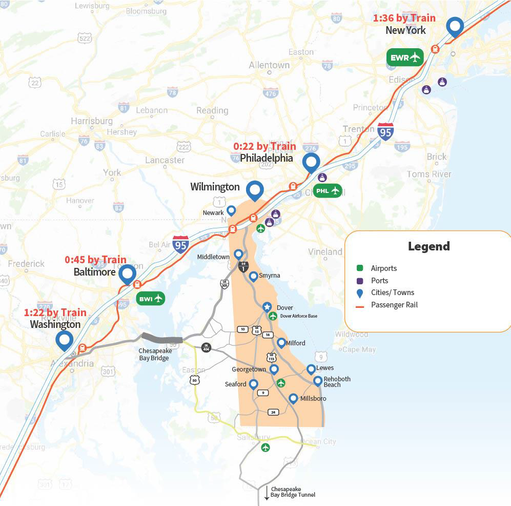 Delaware also offers freight and commercial rail service to reach 50 million people with 250 miles, including: