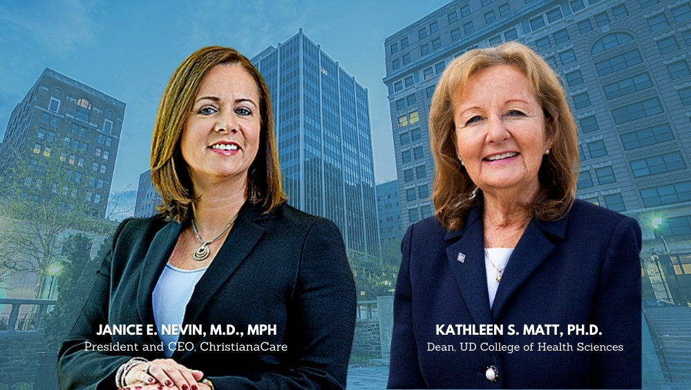 In Delaware, innovation is all about getting people in the room, said Dean Kathleen S. Matt, Ph.D., of UD’s College of Health Sciences, who partnered with ChristianaCare President and CEO Janice E. Nevin, M.D., MPH, to deliver the webinar’s keynote address. While other states may get people into a room for conversation, Matt said, Delaware’s advantage is that action steps follow those conversations.